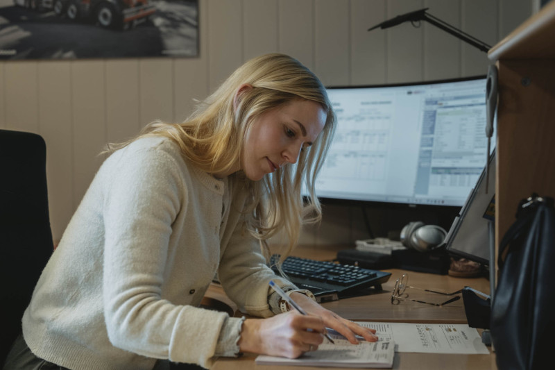 Frøydis Amundal jobber med booking og bruker både penn og ulike datasystemer gjennom en arbeidsdag. Foto: Allsidig Design
